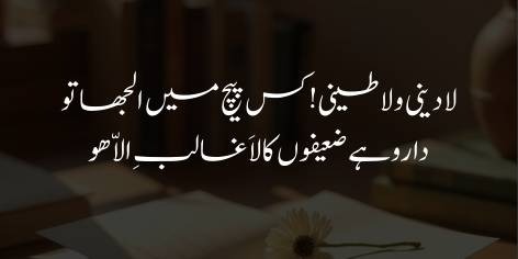 Ae Musalman! Tu la-deeni (secularism) aur Latini rasm-ul-khat jaisi behson ke kin uljhanon mein par gaya hai? Yaad rakh, hum jaise kamzoron ke liye asal ilaj aur taqat sirf iss haqiqat mein hai ke “Allah ke siwa koi ghalib nahi” (La Ghaliba Illah Hu).