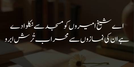 Ae Sheikh! In dunya-dar ameeron ko masjid se nikalwa de, kyunke in ki be-rooh aur dikhawe ki namazon se masjid ka mehrab bhi gusse mein hai aur iss ki teyori charhi hui hai.