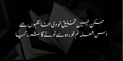 Khanqahon se ab woh “Khudi” paida nahi ho sakti jo dunya ko badal de. Yeh aise sholay ki tarah hain jo geela ho chuka ho. Geelay sholay se chingari nahi nikalti, isi tarah be-amal khanqahon se koi inquilab paida nahi ho sakti.