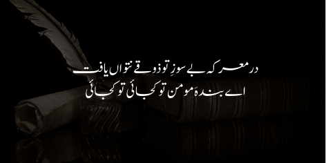 اقبال بڑی دردمندی سے مردِ مومن کو پکارتے ہیں کہ “اے بندۂ مومن! تو کہاں ہے؟” وہ کہتے ہیں کہ زندگی کے معرکوں اور حق و باطل کی جنگ میں تیرے ایمانی سوز اور تڑپ کے بغیر کوئی مزہ اور لذت نہیں۔ جب تک تیری جیسی شخصیت میدان میں نہیں آئے گی، باطل کا مقابلہ نہیں کیا جا سکتا اور نہ ہی زندگی میں وہ حقیقی جوش پیدا ہو سکتا ہے جو انقلاب لاتا ہے۔