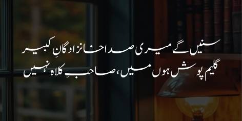 Kya baray baray sardar aur khan meri iss awaz par kaan dharein ge? Mein to ek mamooli kamli-posh (darvesh) hoon, mera dunya-wi jah-o-jalal wale sahib-e-kulah logon se kya muqabla?