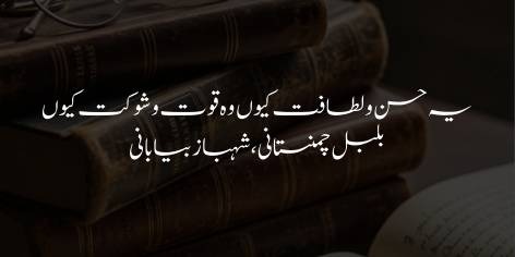 (Qudrat ki taqseem dekho!) Ek taraf husn aur nazakat hai, doosri taraf quwwat aur shan-o-shaukat. Bulbul chaman ke baghon ke liye hai, lekin Shahbaz (uqaab) ki jagah byaban ki wusat-ein hain.