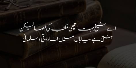 اے شیخ! اسکولوں اور مدرسوں (مکتب) کی فضا بہت اچھی ہوگی، لیکن یاد رکھو کہ حضرت عمر فاروق (رض) جیسی جلالت اور حضرت سلمان فارسی (رض) جیسی درویشی بیابانوں کی سختیوں ہی میں جنم لیتی ہے۔