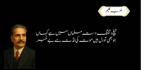 Aaj Musalman ke hath mein na to talwar hai aur na bandook; woh har qism ki madi aur fouji quwwat se mahroom ho chuka hai. Lekin agar farz karein ke us ke paas aslah aa bhi jaye, tab bhi woh use istemal nahi kare ga, kyunke us ke dil se shahadat ka jazba aur maut ki woh mithas (lazzat) khatam ho chuki hai jo ek sache momin ka khassa hoti hai.