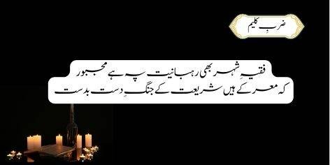 Shehar ke bade mazhabi aalam (faqeeh) ka haal bhi kuch mukhtalif nahi. Woh bhi gosha-nasheeni aur khamoshi ikhtiyar karne par majboor hai, kyunke shariat ke haqaiq ko barmala bayan karne ke liye jurat aur waqt ke hukmaranon se takrane ki zaroorat hoti hai.