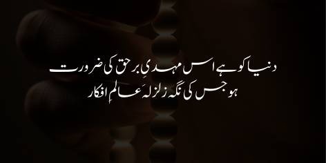 Aaj ki dunya ko ek aise sacche rehnuma (Mahdi-e-Barhaq) ki zaroorat hai jis ki baseerat aur ek hi nigah insani fikr ki dunya mein ek zalzala barpa kar de aur logon ko un ke zehni zandanon se azad kar ke nayi raah dikhaye.