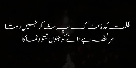 Mitti ke neeche chhupa hua ek chhoti sa beej andhere mein pade rehne par iktifa nahin karta. Us ke andar har waqt ek junoon aur tarap hoti hai ke woh mitti ko phaar kar bahar nikle aur nash-o-nama pa kar ek tanawar darakht ban jaye. Woh apni halat par be-kar baithne ko sabir hona nahin samajhta.