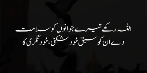 دعا ہے کہ اللہ تمہاری تربیت میں موجود نوجوانوں کو سلامت رکھے، لیکن تمہارا کام انہیں صرف ورد و وظائف سکھانا نہیں ہے۔ بلکہ انہیں “خود شکنی” (اپنے غرور کو توڑنے) اور “خود نگری” (اپنے اندر کی چھپی ہوئی صلاحیتوں کو پہچاننے) کا سبق دو تاکہ وہ اپنی حقیقت سے واقف ہو سکیں۔