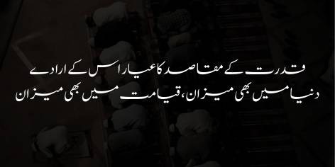 مومن کے ارادے قدرت کے مقاصد کی کسوٹی ہوتے ہیں۔ وہ اس دنیا میں بھی حق اور باطل کے درمیان فرق کرنے والا ترازو (میزان) ہے اور قیامت کے دن بھی اس کا کردار گواہی دے گا۔