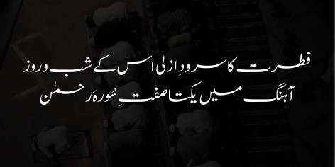Momin ki zindagi ke din aur raat fitrat ke azli raag ki tarah ham-ahang hote hain. Us ki zindagi ki tarteeb aur khoobsurti Surah Rehman ki aayat ke husn aur asar jaisi hoti hai.