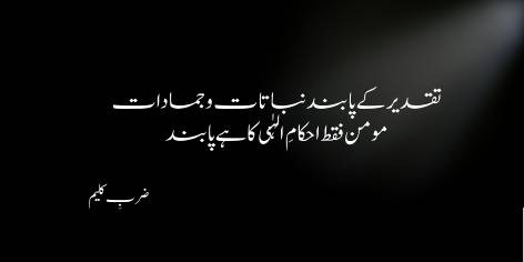 Taqdeer ki pabandi to be-jaan cheezon (jamadaat) jaise patthar aur mitti, ya poudon (nabataat) ka kaam hai, kyunke un ke paas apni koi marzi nahi hoti. Lekin ek sacha momin aisi be-jaan makhlooq nahi hai; woh ek mutaharrik aur zinda hasti hai. Us ki zindagi ka maqsad sirf aur sirf Allah ke ahkamaat ki tameel hai.