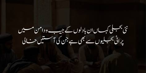 Iqbal ek khoobsurat ista’ara (metaphor) istemal karte hue kehte hain ke in rehnumaon ki misaal in badalon jaisi hai jin ke daaman mein koi nayi bijli (naya jazba ya inqalab) maujood nahi hai. Balkay afsos to yeh hai ke in ke paas wo purani bijliyan (aslaf ka jazba aur ghairat) bhi nahi rahin jin se kabhi in ke buzurgon ki aasteenein bhari hoti thin. Jab in ke paas na maazi ki taqat hai aur na mustaqbil ka koi naya nazriya, to wo qoum ki islah kaise kar sakte hain?