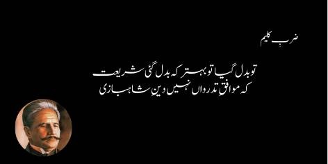 Agar tum ne waqt ke badalte hue halat ke samne hathyar daal diye hain aur apni gairat kho di hai, to yaqeenan tumhare liye deen ke taqaze bhi badal gaye honge. Yaad rakho ke Shaheen ki tarah bulandiyon par urne walon ke usool buzdil aur kamzor parindon jaise nahi ho sakte.
