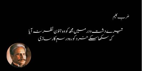 Main ne tumhari mehfilon aur tumhare weeranon mein woh sacha ishq aur tarap nahi dekhi jo insan ki aqal ko maslahat-pasandi se nikaal kar bade kaam karne ka hausla de sake. Tumhari aqal sirf tumhein faide aur nuqsan ke chakkar mein uljhaye rakhti hai kyunke tumhare paas woh junoon-e-ishq nahi jo mushkil raston ko aasan bana deta hai.
