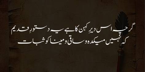 Agarche is duniya (Dair-e-kuhan) ka yeh purana asool hai ke yahan kisi cheez ko dawam nahi; na peene pilane wale rahen ge, na pyale aur na mehfilein. Yani iqtedar aur nizam hamesha badalte rehte hain. Koi bhi hukumat ya taqat hamesha ke liye nahi hoti.