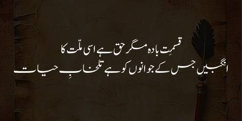 Lekin iqtedar aur kamyabi ki “Sharab” peene ka haq sirf usi qoum ko hasil hai jis ke jawanon ko zindagi ki sakhtiyon aur karwahat (Talkhab-e-hayat) ko shehad (Angbeen) samajh kar peene ki aadat ho. Murad yeh hai ke jo qoum mehnat, mushaqqat aur mushkil pasandi se nahi ghabrati, wahi duniya mein hukm rani karne ki haqdar theherti hai.