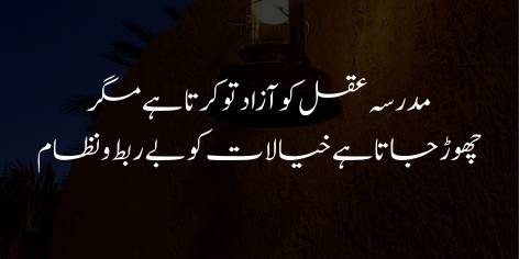 Jadeed taleemi idaray (madresay aur college) insan ko purani riwayaat ki zanjeeron se nikaal kar aqal ko azadi to dete hain, lekin wo khayalat ko koi tarteeb ya nazm-o-zabt nahi de paate. Talib-e-ilm buhat si maloomat to hasil kar leta hai lekin wo maloomat bikhri hui hoti hain, jin ka aapas mein koi taaluk nahi hota. Nateeja ye nikalta hai ke insan ilm ke bawajood kisi wazay maqsad-e-zindagi tak nahi pohanch pata.