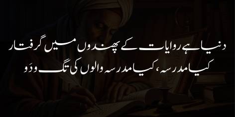 Aaj ki poori duniya purani aur boseeda riwayaat ke jaal mein phansi hui hai aur lakeer ki faqeer bani hui hai. Yehi haal taleemi idaron ka hai; na to madreson ke nisab mein koi jiddat hai aur na hi wahan ke asataza ki dour-dhoop mein koi ooncha maqsad nazar aata hai. Un ki tamam tar koshishen sirf riwayati tareeqon ko barkarar rakhne tak mahdood hain, jin se koi bada inqilab nahi aa sakta.