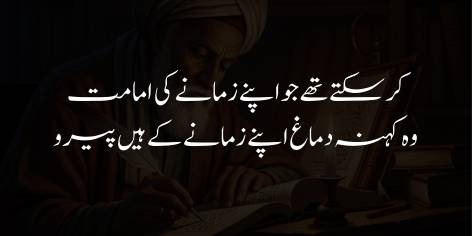 افسوس تو اس بات کا ہے کہ وہ اساتذہ جنہیں اپنے دور کی رہنمائی اور امامت کرنی چاہیے تھی، وہ اپنی پرانی اور فرسودہ سوچ (کہنہ دماغ) کی وجہ سے خود زمانے کے پیچھے چلنے والے بن گئے ہیں۔ وہ وقت کے تقاضوں کو سمجھنے اور نئی نسل کو راستہ دکھانے کے بجائے، خود حالات کے دھارے میں بہہ رہے ہیں اور اپنی تخلیقی قوت کھو چکے ہیں۔