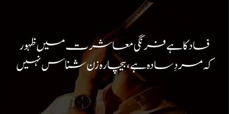 Iss bigar aur fasad ki asal jar Maghribi (Farangi) tarz-e-muashrat hai, jahan azadi ke naam par aurat ko ghar ki malka banane ke bajaye numaish ki cheez bana diya gaya. Iqbal tanziya andaz mein kehte hain ke mard bechara bohat sada hai, wo aurat ki haqiqi nafsiyat aur uss ki qadr-o-qeemat ko pehchan-ne se qasir hai. Maghribi tehzeeb ki taqleed mein mard ne aurat ke asal martabay ko hi bhula diya hai.
